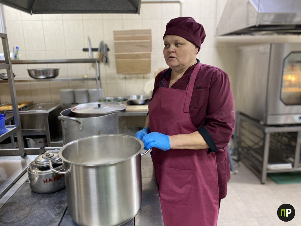 За плитами здесь работает команда из двух поваров. Один из них — Раиса Садовская, повар 4-го разряда с 38-летним стажем работы именно в этой столовой. Ее рабочий день начинается в 7.00.
