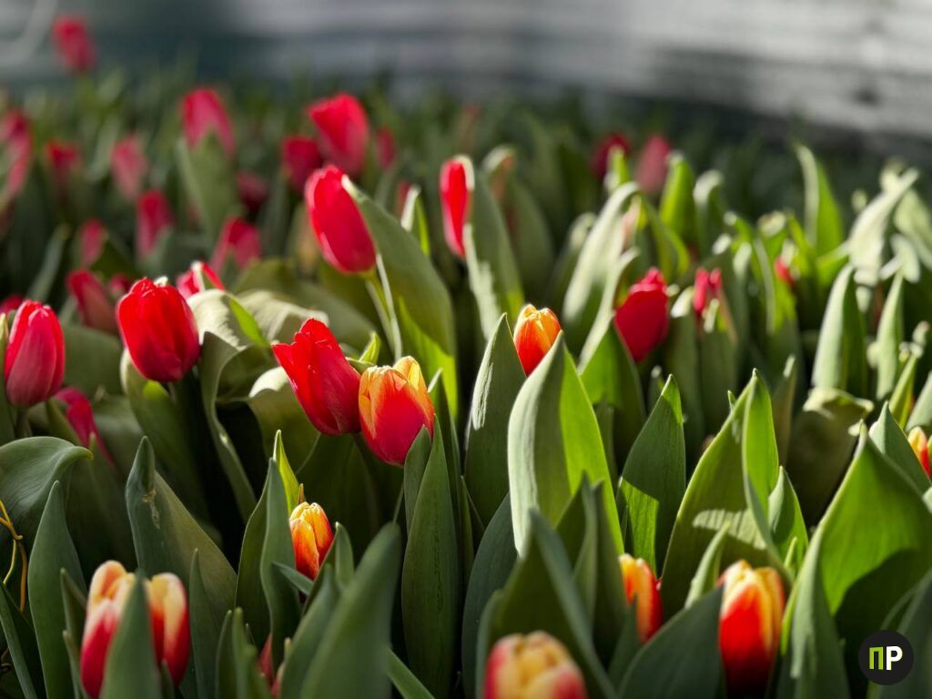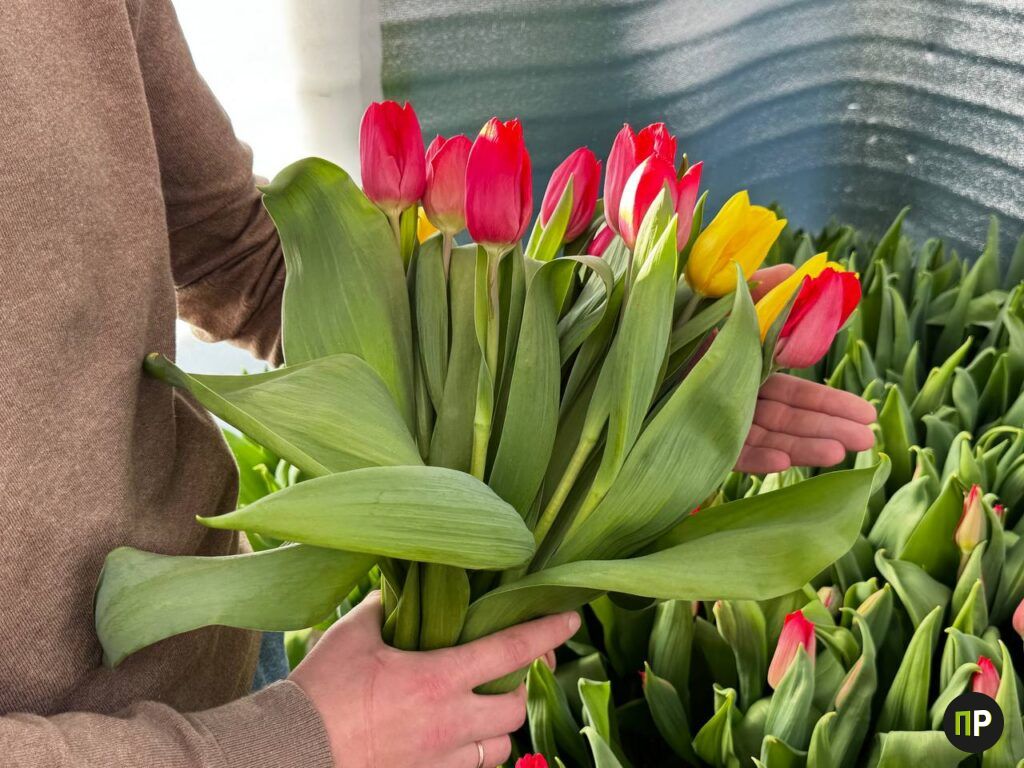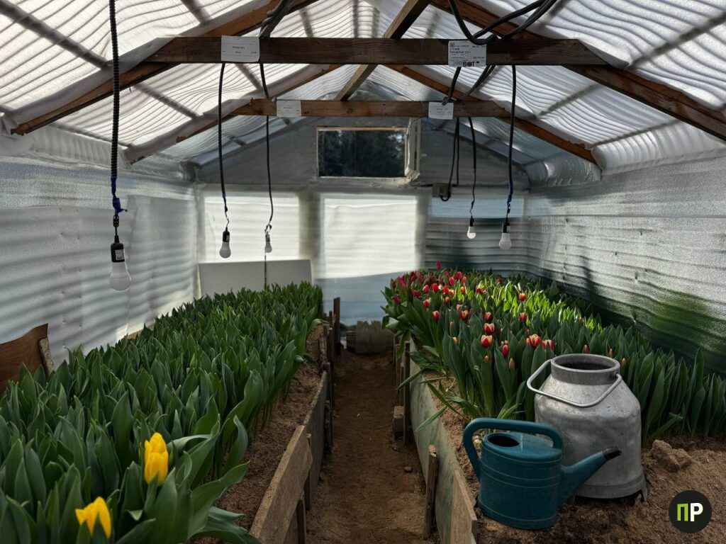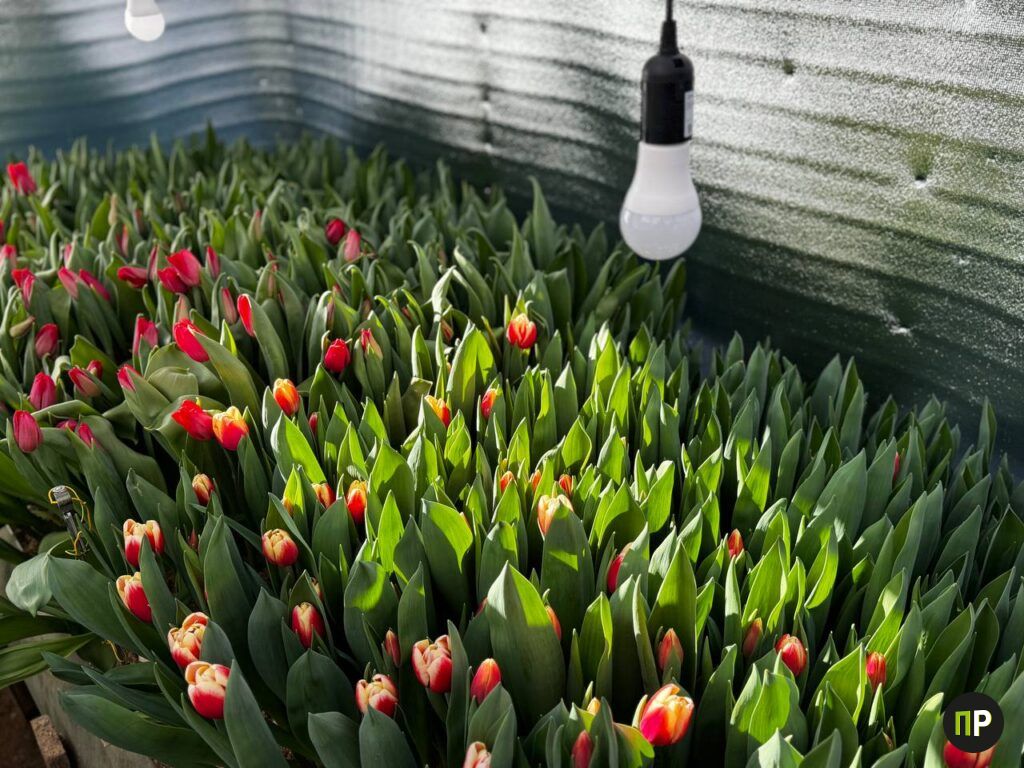 Сейчас в теплице работают два обогревателя и обычные лампочки, никакой специальной фитотехники — лишь тепло и влага. На грядках тянутся к свету высокие стебли. Часть тюльпанов уже распустилась: желтые, бордовые, красные с белой каемкой. Аромат стоит весенний и тонкий, совсем не тепличный.