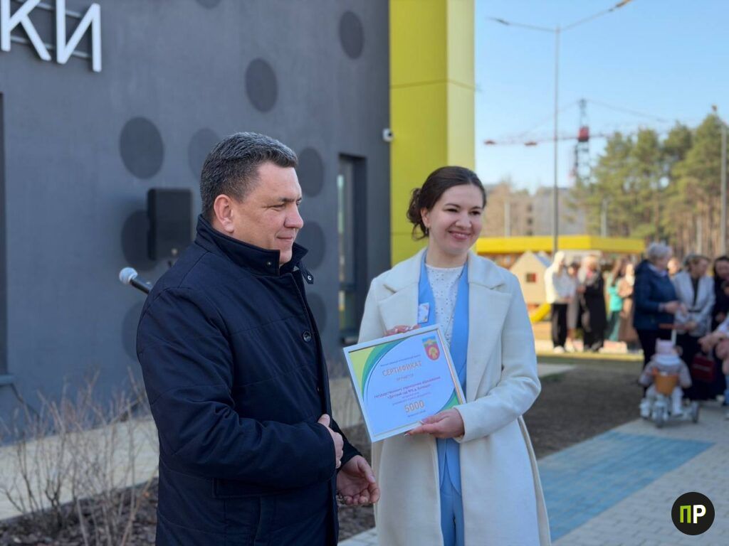 Председатель Минрайисполкома вручил заведующей детским садом Дарье Толкач сертификат на 5000 белорусских рублей.