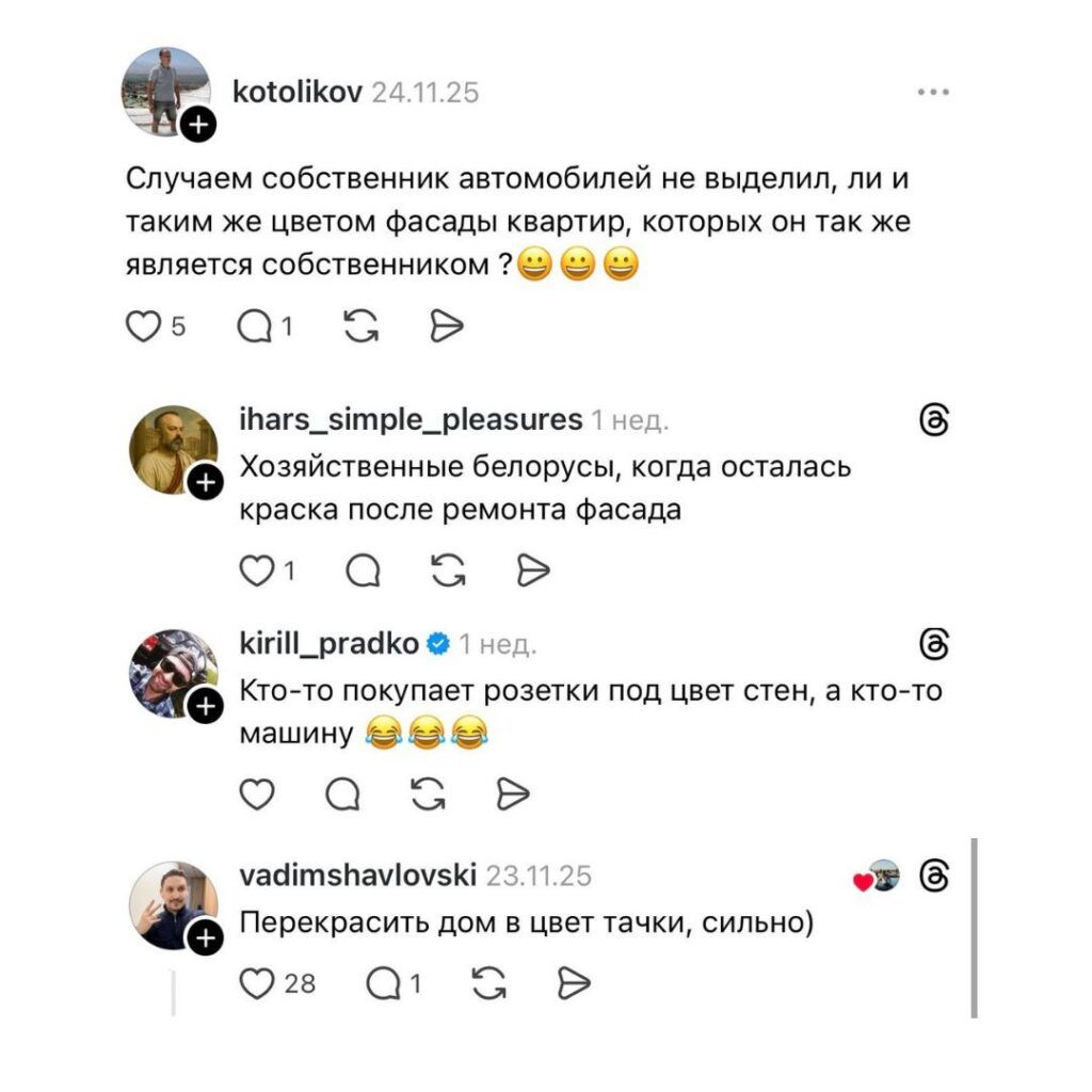 Это наблюдение породило главный вопрос: намеренно ли жители выбирают автомобиль, идеально повторяющий палитру стен, или перед нами просто цепь забавных совпадений? Дискуссия развернулась в комментариях, где восхищение чередовалось с иронией и живым любопытством.