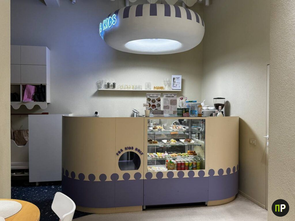 В игровой комнате есть пространство, где можно выпить кофе и перекусить. В меню – запеканки, макароны, супы. Их подают в виде забавных зверюшек, что выглядит очень мило. Взрослым предлагают разные виды кофе, чая, а детям – молочный коктейль или сок.