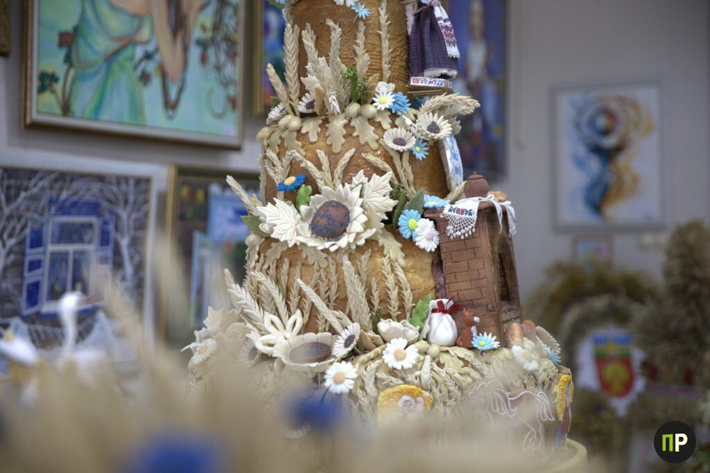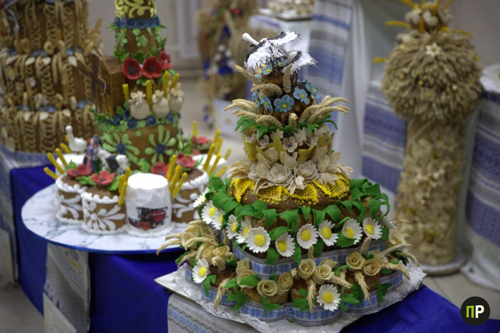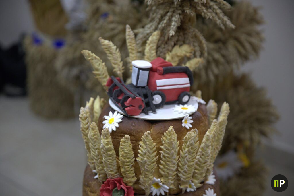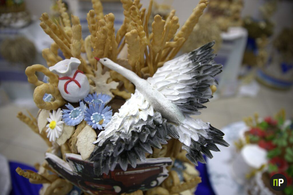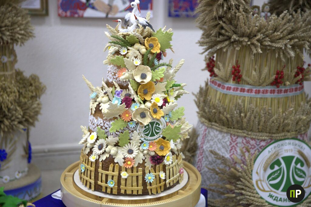Каравай от ОАО «Рапс» украсила фигурка бусла — национального символа Беларуси, а в КУП «Минская овощная фабрика» добавили изюминку в виде пряничных элементов.