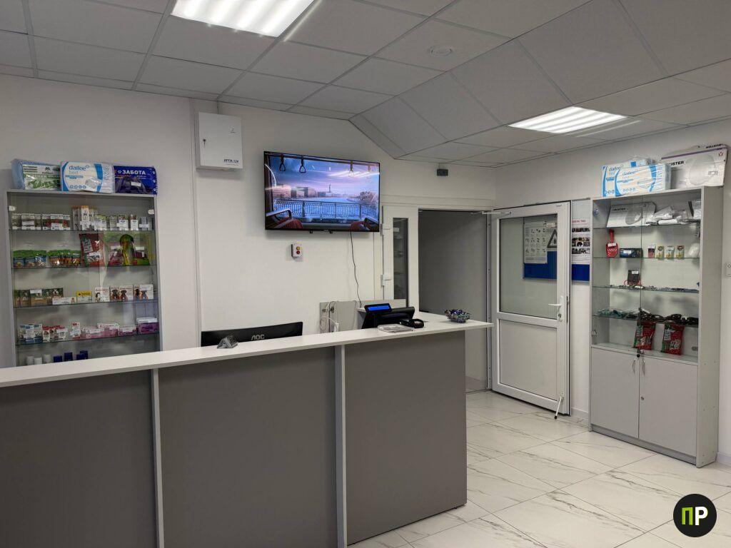 Первое, что видит посетитель, — светлая стойка регистратуры и стеллажи с лекарствами и зоотоварами. Здесь можно сразу купить самое необходимое: противоаллергические и противовоспалительные препараты, обезболивающие, средства при отравлениях, капли для глаз и ушей, пелёнки и лакомства для животных. У входа стоят весы для животных, рядом с которыми уже установлена ёлка.