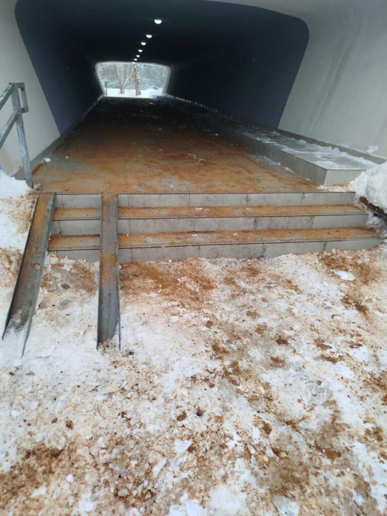 Прошлым летом в Заславле до неузнаваемости изменился переход под дорогой Р-65 Заславль-Дзержинск-Озеро: его благоустроили, пол, стены выложили плиткой. Однако зимой такое оформление стало полосой препятствий.
