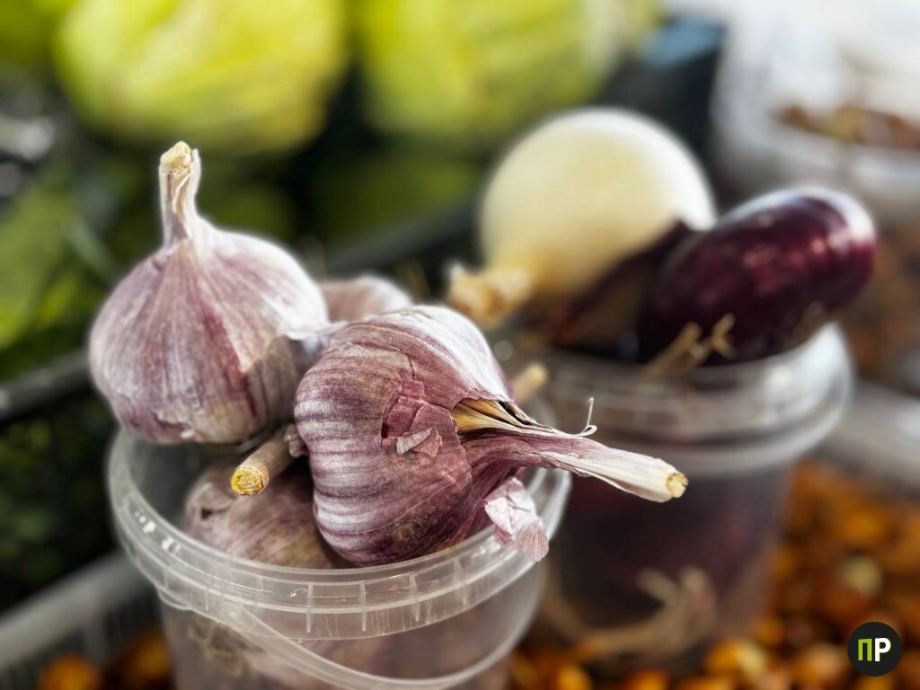 Картошка молодая продаётся по 15 рублей, а обычную, наравне с луком и морковью, отдают по 2 рубля за кило. Баклажаны и цукини стоят по 18 рублей, молодая капуста — 6,50, чеснок — 25 рублей за кило.