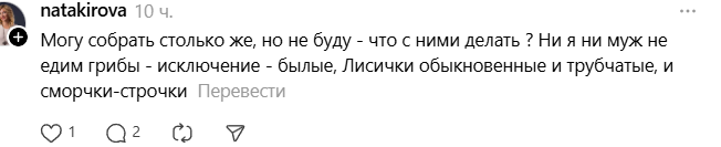 Встретились и такие мнения: «Могу собрать столько же, но не буду — что с ними делать? Лично я и мой муж не едим грибы, за исключением опят, обычных и трубчатых лисичек, а также сморчков и строчков».