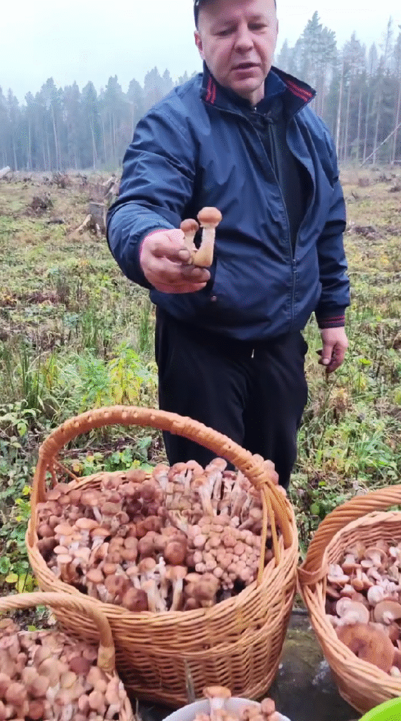 «Грибные войска Беларуси в лесу на вырубке. Сегодня у нас 3 ноября 2025 года. В Колодищах собирали вот таких красавцев — опята. Осенние, ноябрьские опята», — делится впечатлениями автор видео.