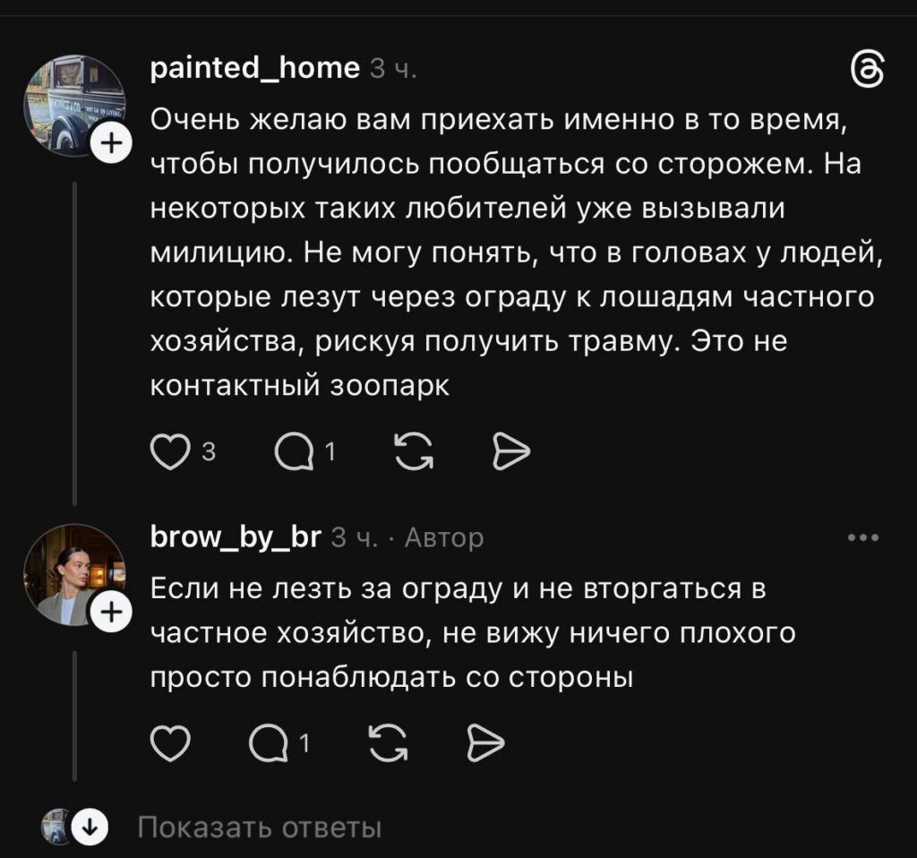 – Очень желаю вам приехать именно в то время, чтобы получилось пообщаться со сторожем. На некоторых таких любителей уже вызывали милицию. Не могу понять, что в головах у людей, которые лезут через ограду к лошадям частного хозяйства, рискуя получить травму. Это не контактный зоопарк, – отмечается в обсуждениях.