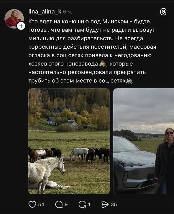 В 20 минутах езды от Минска, в деревне Ляховщина, находится хозяйство «Конный завод». На его территории расположены три конюшни, родильное отделение и около 150 гектаров пастбищ. В последнее время это живописное место стало популярным среди желающих сделать атмосферные фотографии, локация распространяется через Threads. Посетители фотографируются с лошадьми, иногда их гладят. Активность в соцсетях привлекла внимание к локации и спровоцировала острую дискуссию.