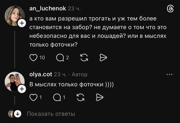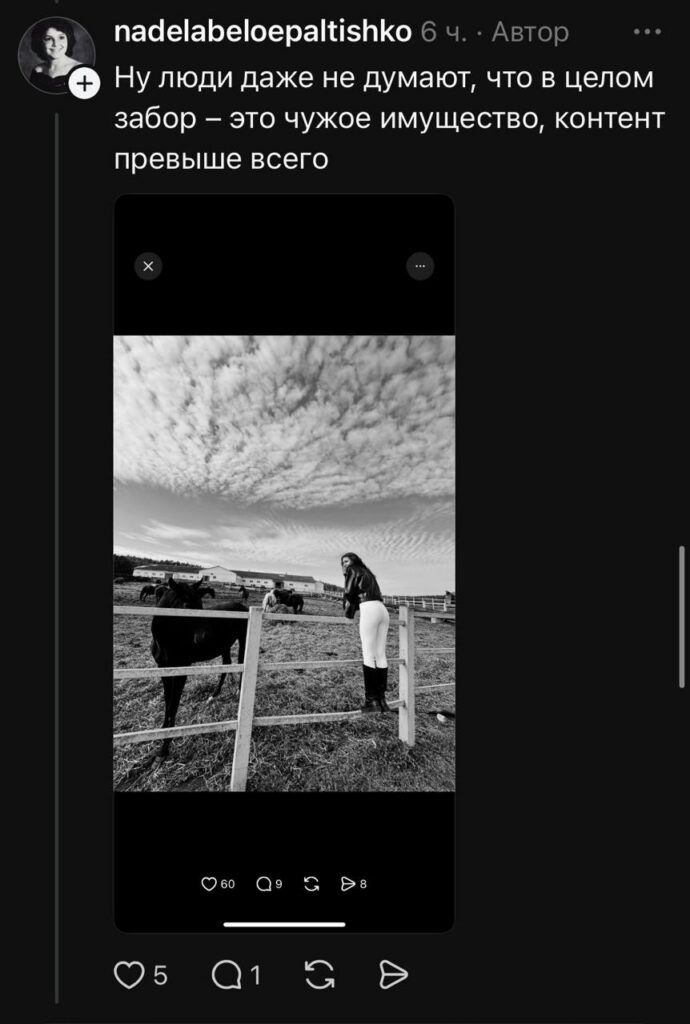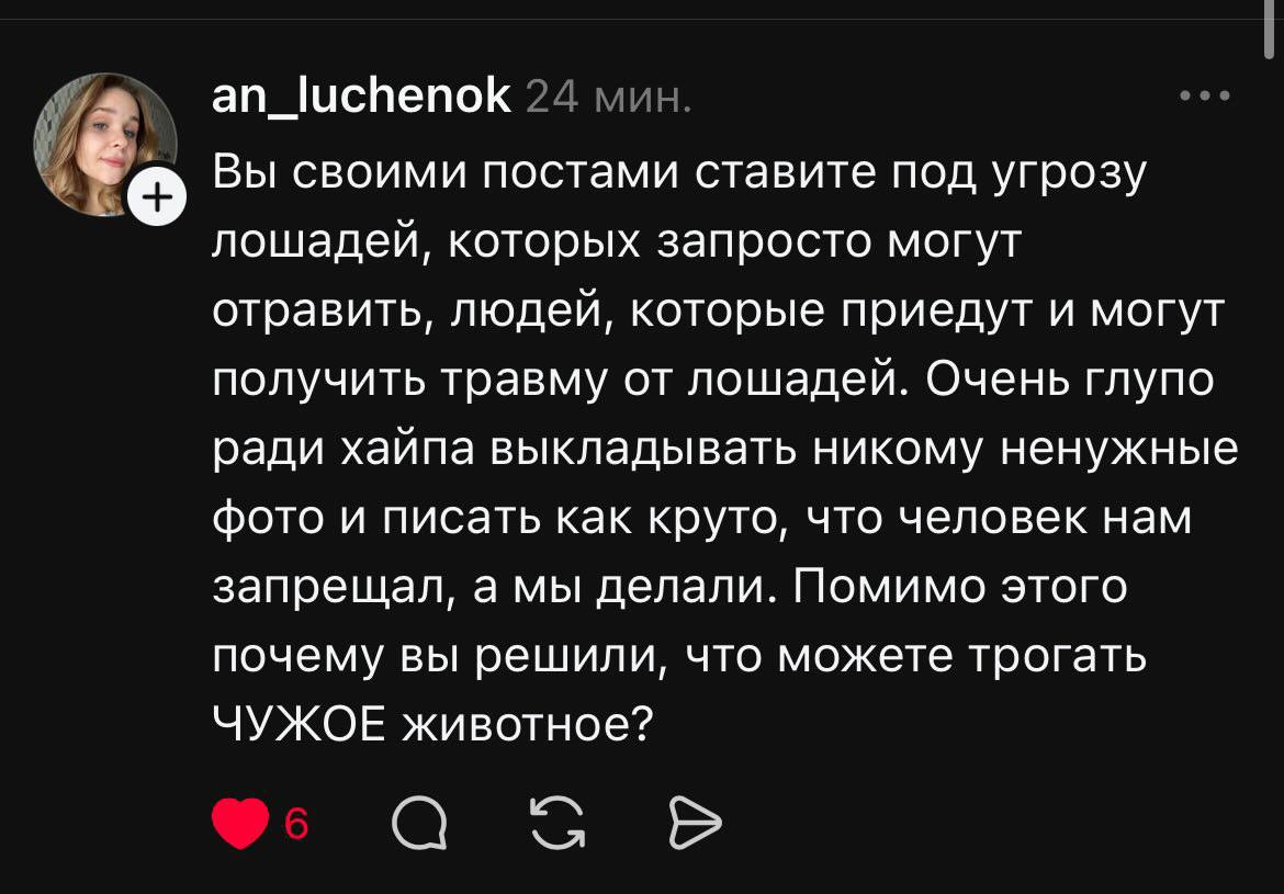 – Вы своими постами ставите под угрозу лошадей, которых запросто могут отравить, людей, которые приедут и могут получить травму… Помимо этого, почему вы решили, что можете трогать ЧУЖОЕ животное? В мыслях только фоточки? – пишет один из пользователей.