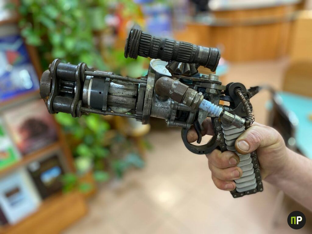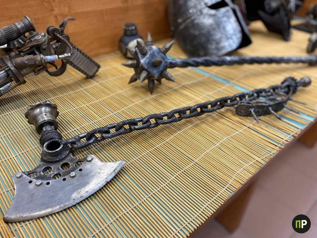 На выставке также есть первая работа Владимира — мотоцикл. При его создании он использовал подшипники и болты. Представлено и оригинальное оружие, сделанное из карниза для штор. Иголки на набалдашнике Владимир вытачивал вручную. Мужчина смастерил даже футуристичный пистолет с манометром: на создание его вдохновила видеоигра. В конструкции использована двойная цепь и автомобильная свеча.
