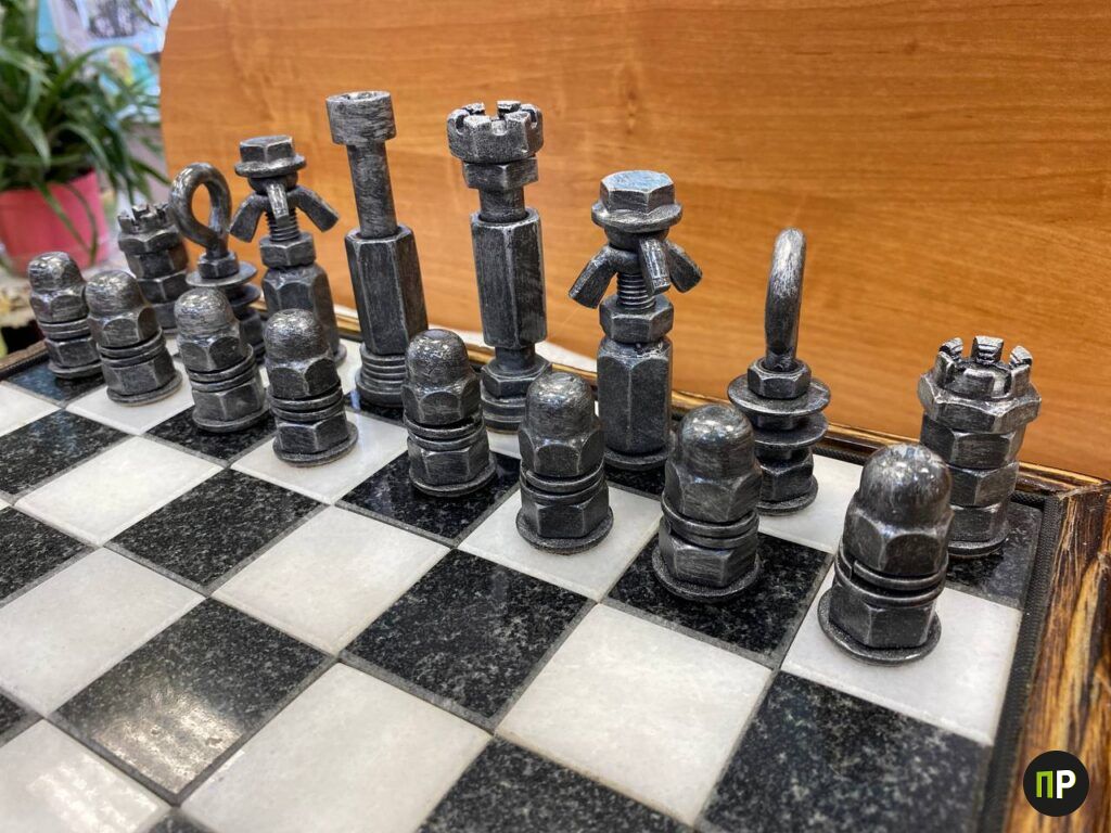 Каждая фигурка уникальна. Например, королева собрана из автомобильного болта, усиленной гайки и шайб. Король выполнен в том же стиле, но оказалось сложно визуально передать его величие. Пешки мастер сделал на основе гаек и болтов.