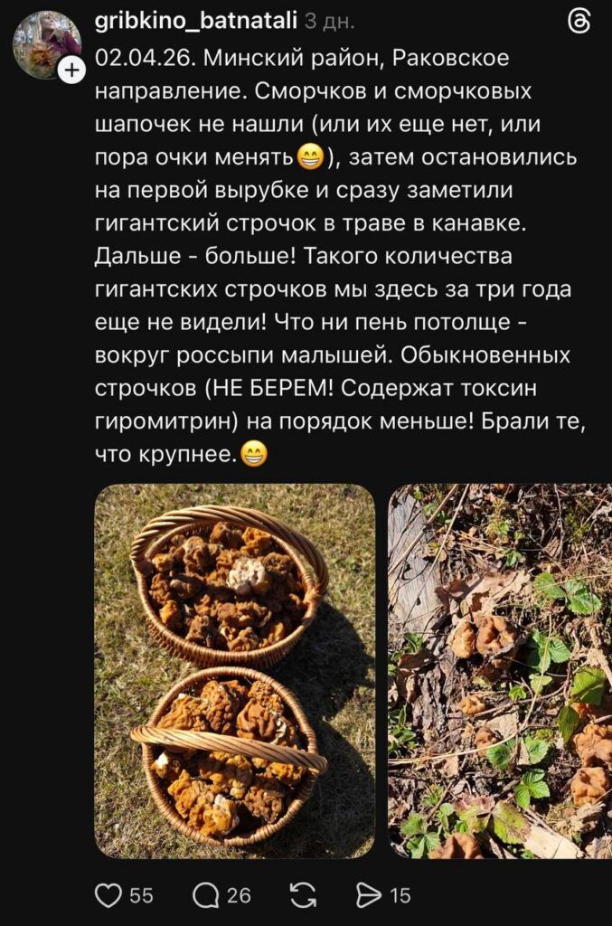 В Threads мы заметили пост о том, что в Минском районе нашли местечко, где уже растут грибы – строчки. Девушка опубликовала фото улова, но в комментариях её тут же предупредили: «Смотрите, не отравитесь гиромитринами и гельвелловой кислотой». Разбираемся, насколько эти грибы опасны.