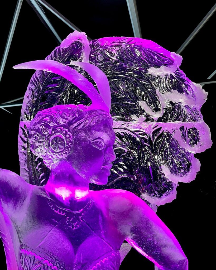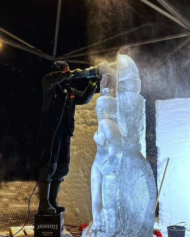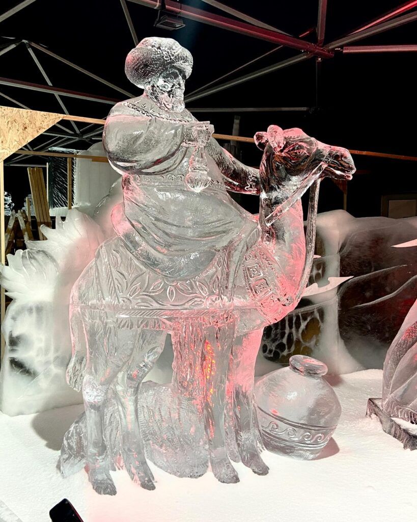 — Форма, на первый взгляд, проста́. Песок трамбуют в огромные пирамиды, с которых скульптор, словно резчик по дереву, начинает снимать слой за слоем. Лёд — это несколько блоков, «спаянных» водой в единую глыбу, — рассказывает мастер.