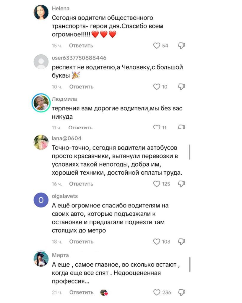«Сегодня водители общественного транспорта — герои! Огромное им спасибо! Едут очень спокойно, на остановках подъезжают максимально близко, терпеливо ждут пассажиров, которые рискуют упасть каждую секунду… Все водители легковушек, оставившие машины дома сегодня, тоже молодцы!» — написала одна из пользовательниц в комментариях.