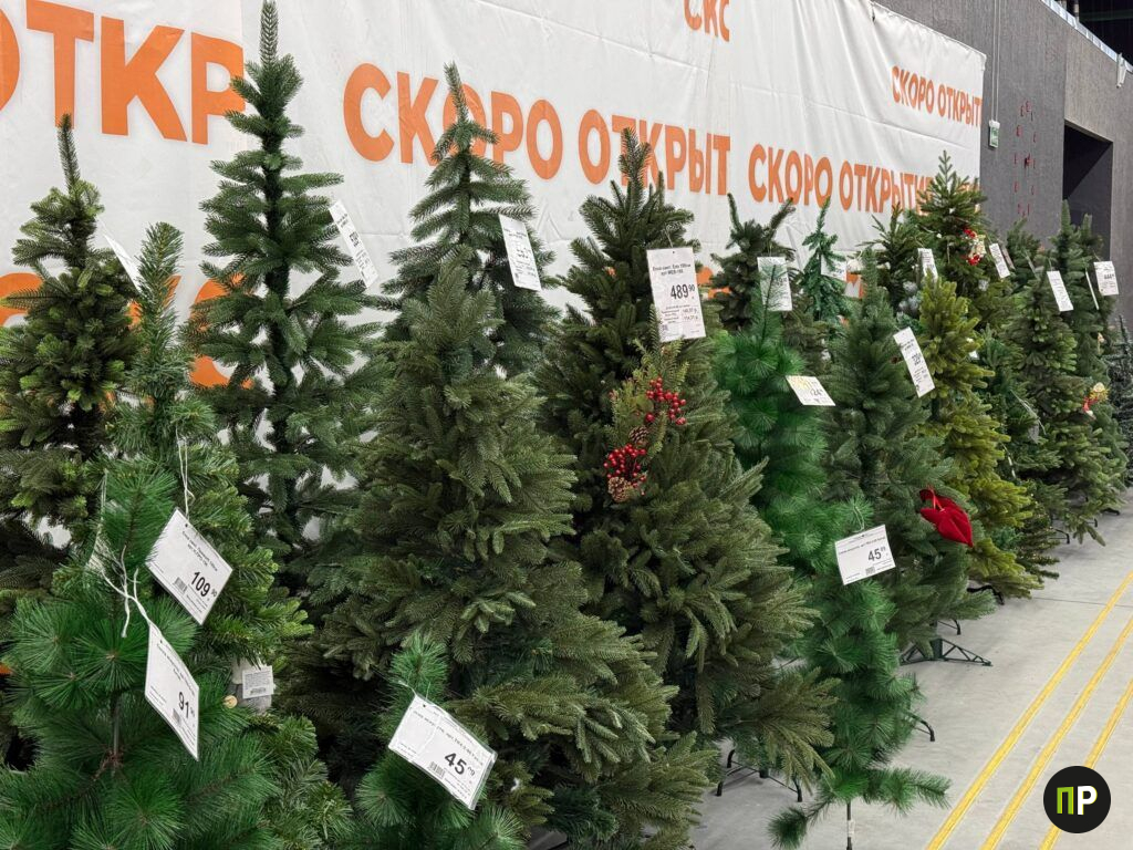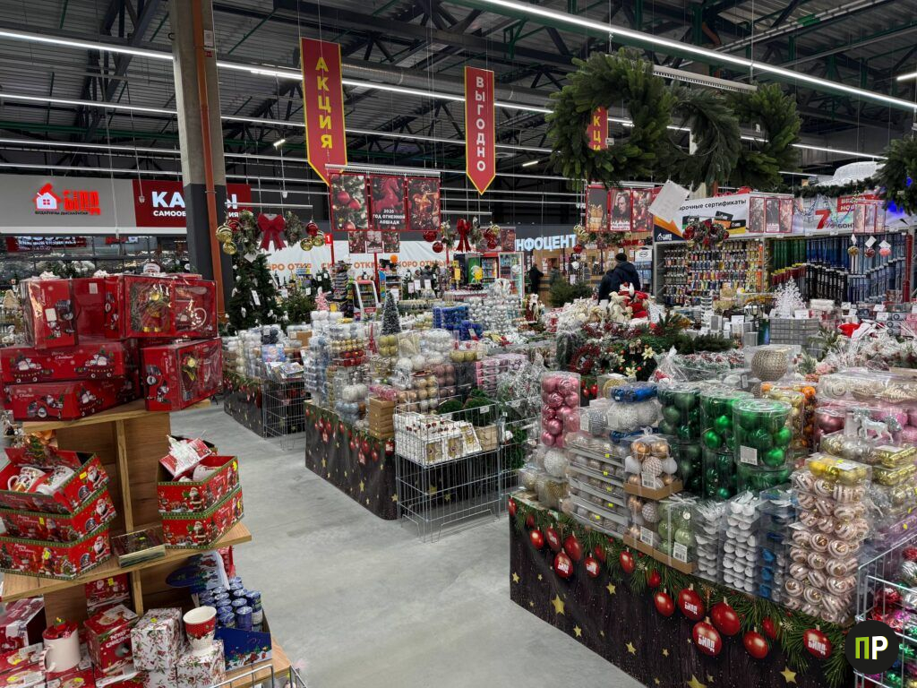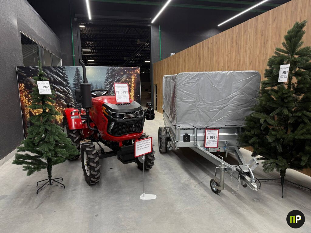 Сразу у входа гостей встречает масштабная праздничная экспозиция: искусственные ели от 25 рублей, живые — в горшках размером 30–50 сантиметров от 26,99, деревце 100–120 сантиметров обойдётся в 97,90, гирлянды, украшения и подарочные наборы. Рядом — самая тяжелая техника: минитрактор за 19 тысяч рублей и прицепы.