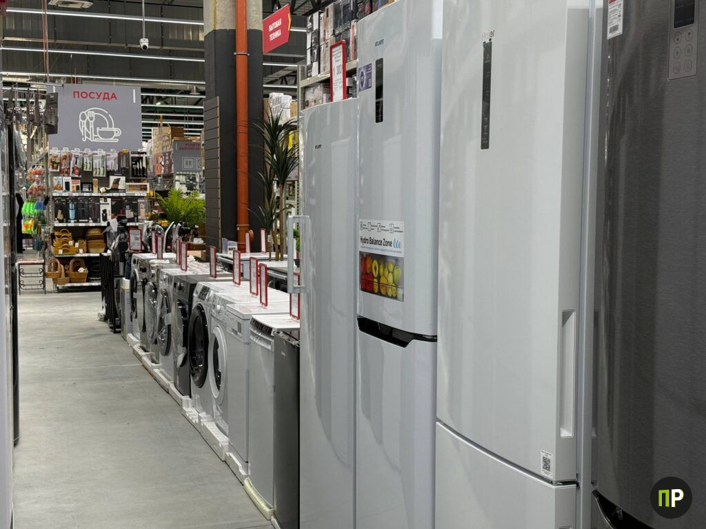 В одном ряду можно увидеть холодильники, стиральные и посудомоечные машины. Рядом — текстиль: постельное бельё, подушки, ковры и даже тапки из обрезков ковра.