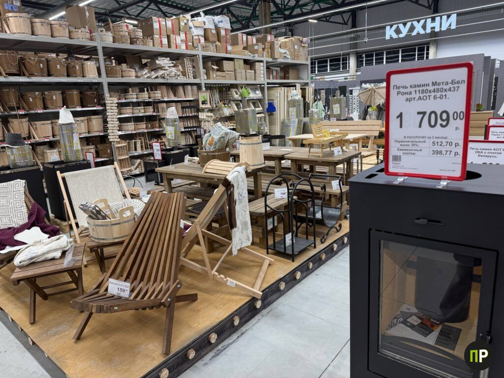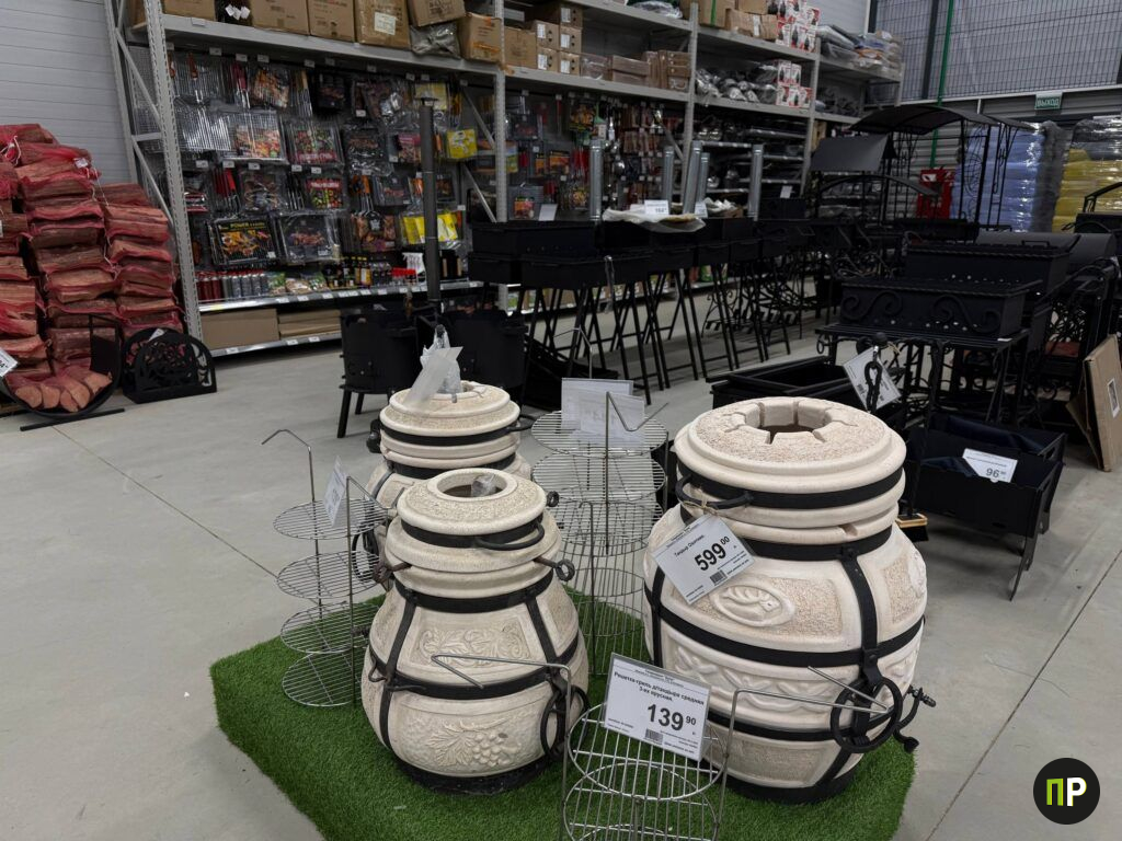 В холодном, но просторном садовом центре представлено всё для загородной жизни: газонокосилки (от 450 до 12 000 рублей), бетономешалки, декоративные пруды (стартуют от 67 рублей), уличная мебель и дровницы. Особое внимание привлекают мангалы, казаны и уже колотые сухие дрова по 6,99. Мы даже нашли настоящий тандыр от 539 рублей.