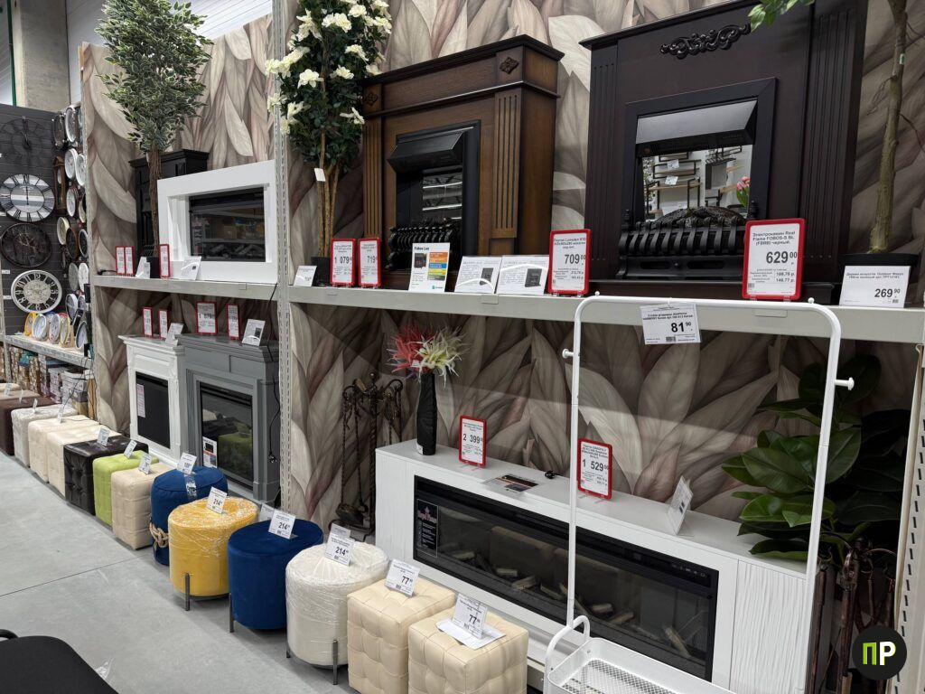 Пять рядов обоев: обычные в среднем от 50 рублей за рулон, есть жидкие от 20 рублей за килограмм. Цены на плитку начинаются от 10 рублей. Душевые кабины (от 400 рублей), электрокамины (от 629 рублей). Здесь есть практически любые материалы для ремонта и строительства.