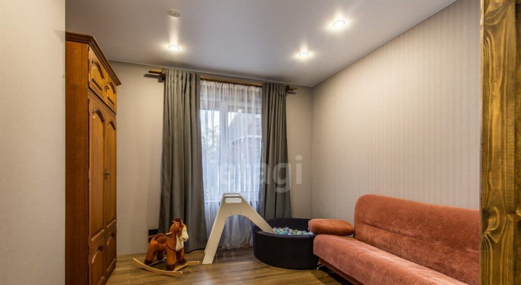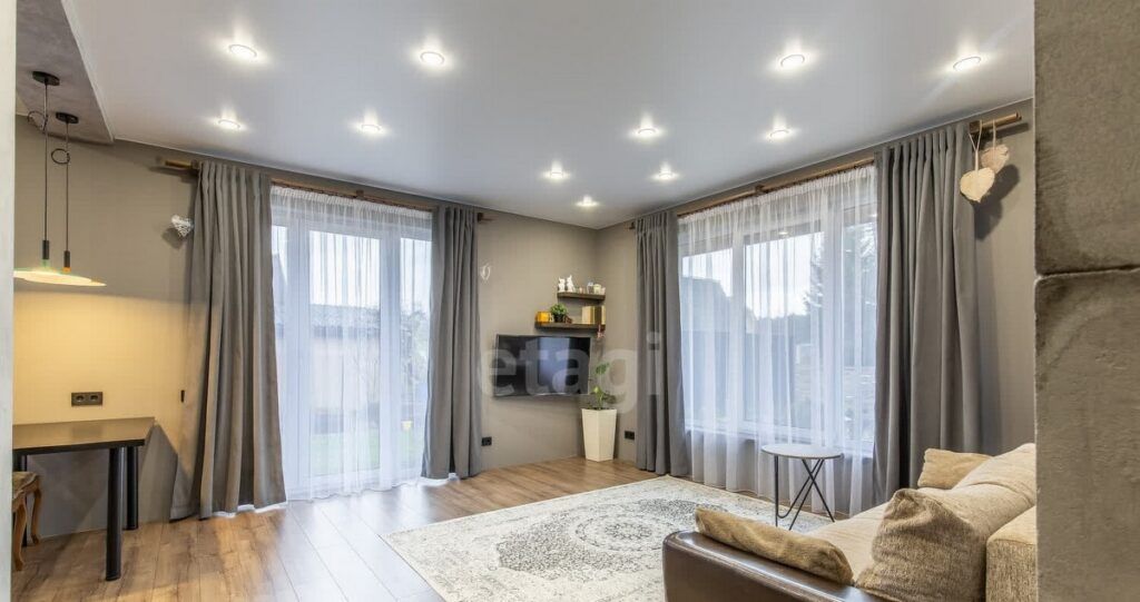 Планировка дома разработана для комфортной жизни: просторная гостиная совмещена с кухонной зоной, есть три отдельные спальни. Хозяйская спальня оборудована собственным санузлом и гардеробной. Также в доме есть отдельный санузел с душевой кабиной, топочная и подвал. Интерьер выполнен в современном стиле, а вся дизайнерская мебель и встроенная кухня с техникой остаются новым владельцам.