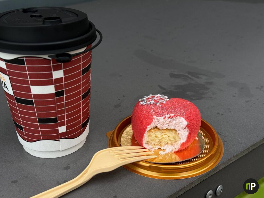 Десерт положили в герметичный контейнер, который удобно брать с собой, но ложечку пришлось просить отдельно. Внутри — лёгкий бисквит и мягкий мусс, сверху чуть хрустящая глазурь с блёстками: по вкусу всё нежное и буквально тает во рту. Латте вышел очень сладким, с ярким ягодным послевкусием. Удобно, что можно заменить молоко на растительное или безлактозное с доплатой.