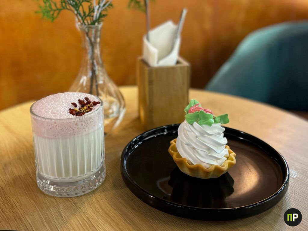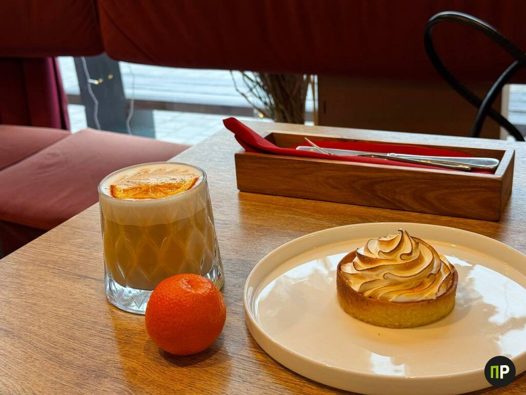 В небольшом, но уютно украшенном кафе мы попробовали сет «Зимние цитрусы» — апельсиновый латте с шепоткой корицы и лимонную тарталетку.