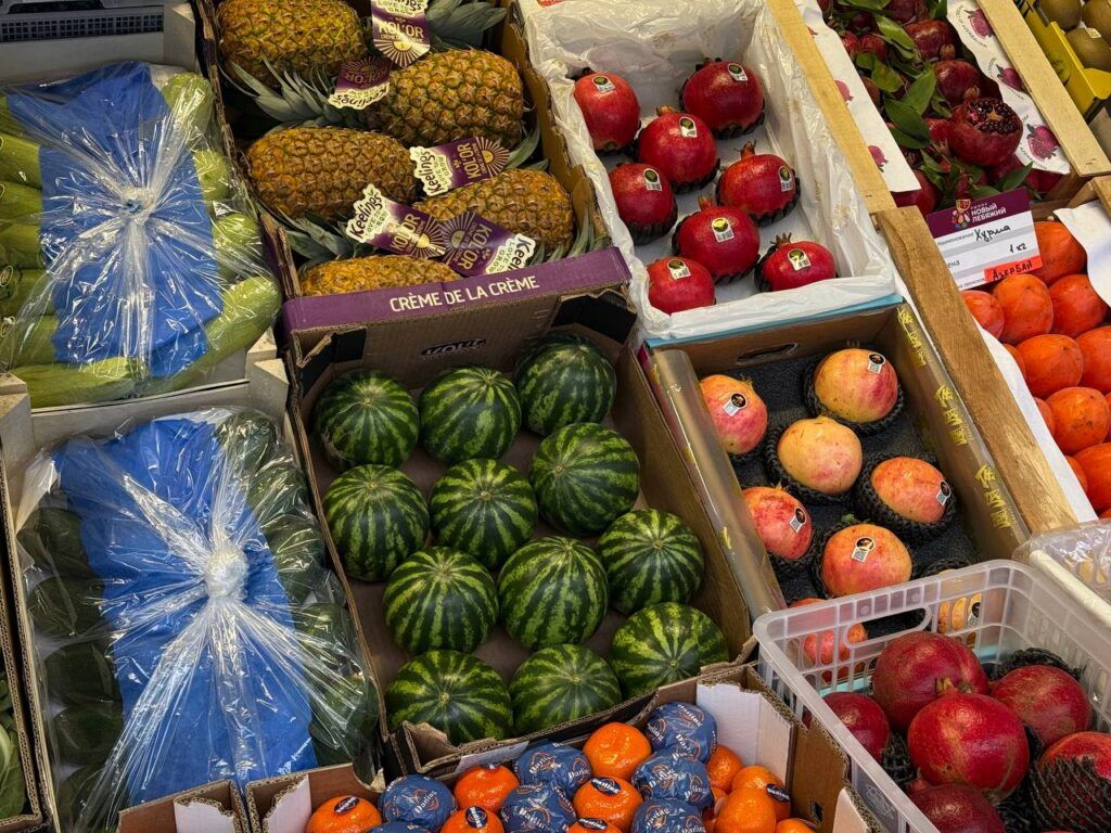 Среди новинок особое внимание привлекли бразильские мини‑арбузы. Они стоят 13,5 рубля за килограмм и продаются ящиками по 10–11 килограммов. Плоды небольшие, ровные, с яркой зеленой полосатой кожурой. Продавец уверяет, что внутри красная мякоть без косточек и что такие арбузы хорошо хранятся.