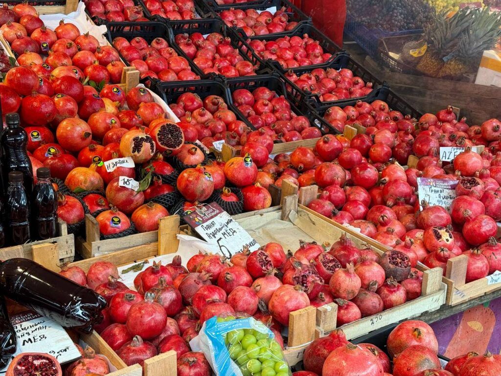 По соседству высятся горки гранатов — до 7 рублей, и ананасов — по 15 рублей за килограмм. Последние уже полностью спелые, с сочной и ароматной мякотью.