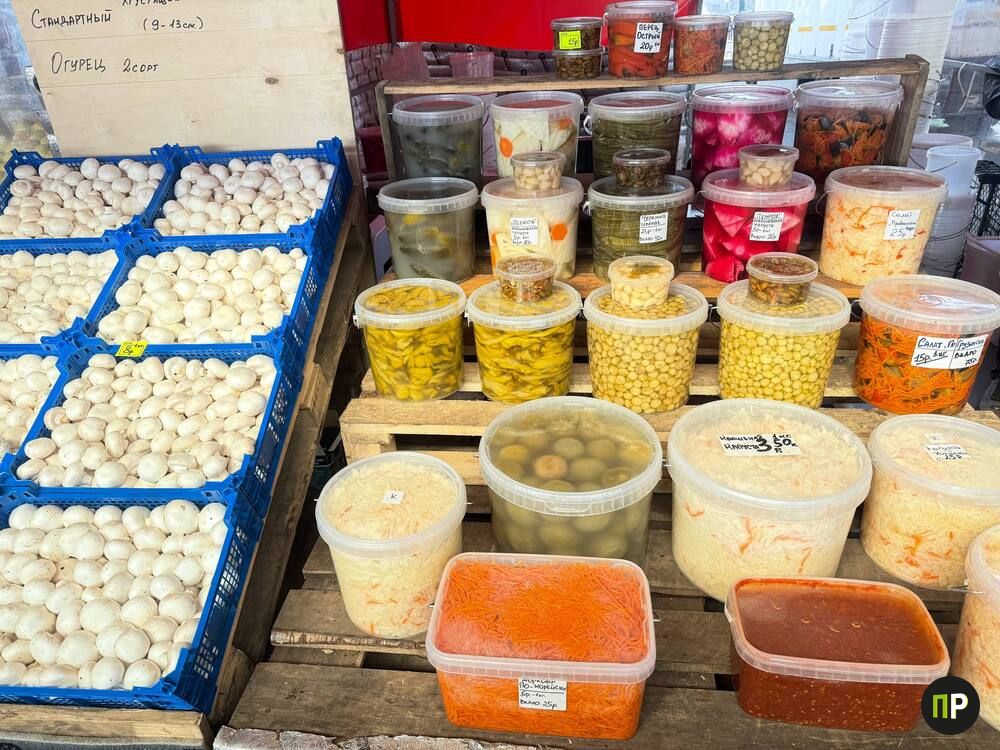 В павильонах с соленьями по‑прежнему широкий выбор спаржи, маринованных перцев, чеснока, разных видов капусты и бочковых огурчиков. Стоимость зависит от объёма: от небольших баночек за несколько рублей до крупных вёдер для тех, кто любит запастись сразу.