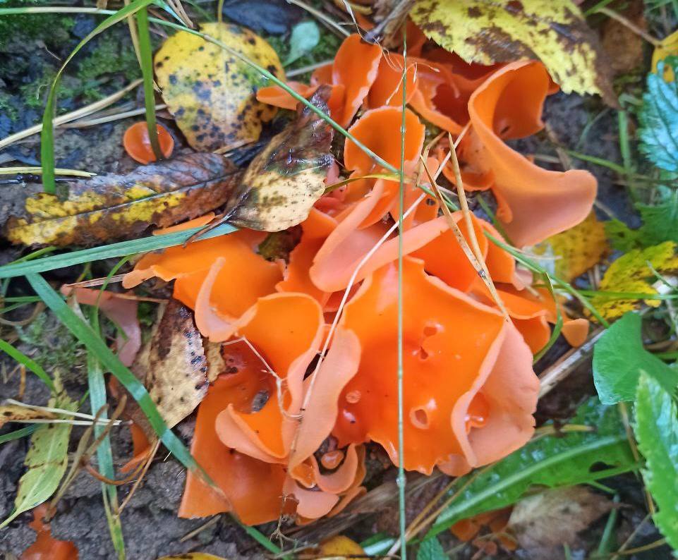Среди привычных лесных обитателей и неожиданности. В этот сезон в лесах Минского района находят алеврию оранжевую — ярко-оранжевый гриб, похожий на цветок. Чаще его используют как декоративный.