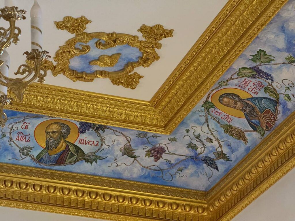Так появилась первая большая работа — роспись свода в верхнем храме, адаптация иконы «Лоза», на которой из трона Вседержителя исходят ветви с изображениями двенадцати апостолов. Позже на стенах появились ещё три картины, которые вместе образуют композицию Страшного суда, каждая со своей символикой.