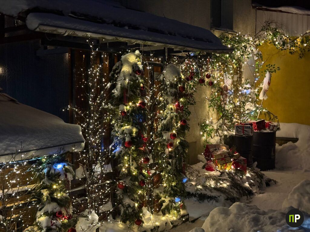 В самом центре поселка Мачулищи мы увидели место, которое в январские вечера похоже на новогоднюю открытку. На торце местного Дома культуры гостей встречают леденцовые ворота, целое стадо резных оленей, гора «подарков» в повозке, украшенные ёлочки и фотозона с зеркалом.