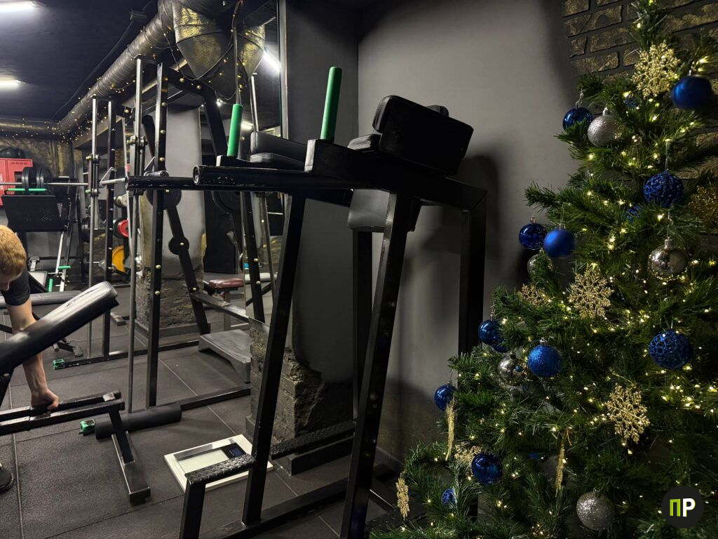 В темноте всё это буквально светится: фасад густо оплетён гирляндами и ветвями, которые создают ощущение сказки. Но за праздничной декорацией скрывается вовсе не модный ресторан и не салон красоты, а небольшой спортивный зал с брутальным названием «Black Gym», расположенный в подвальном помещении.