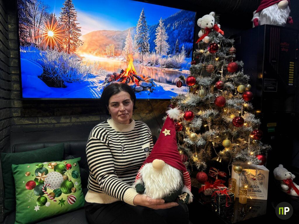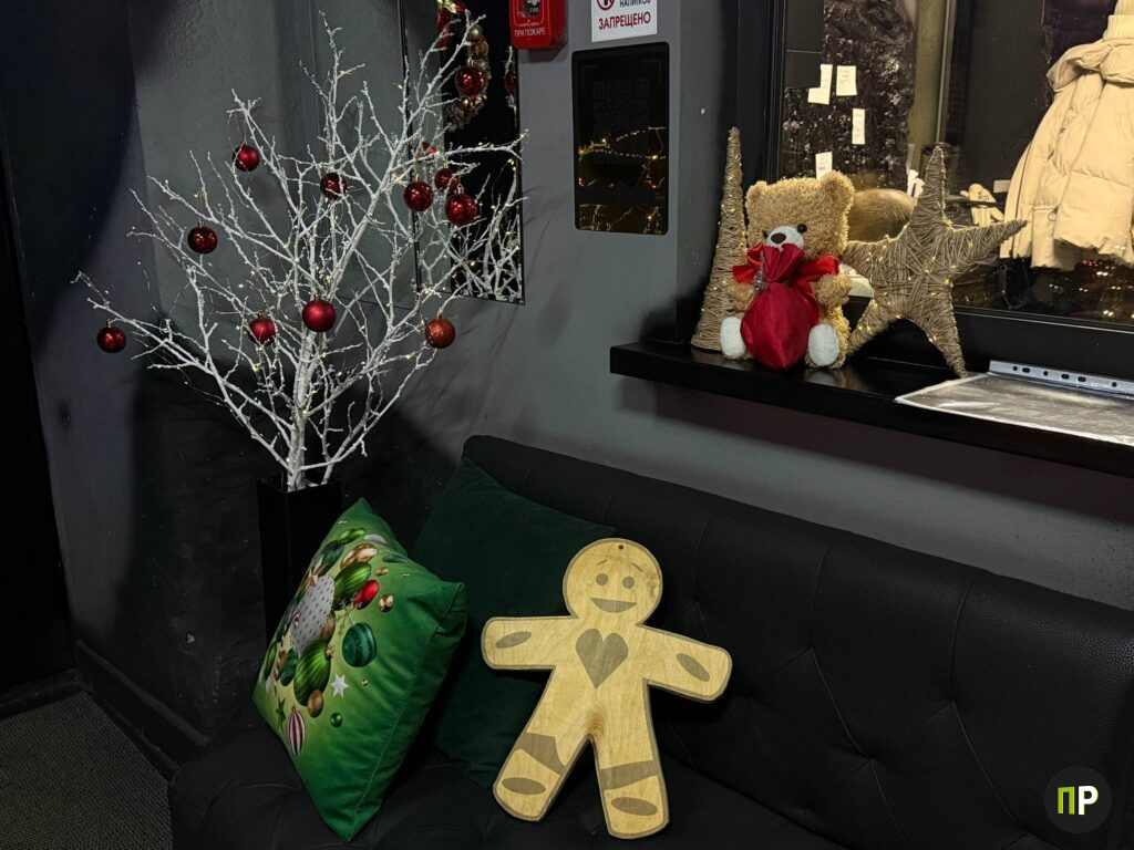 Внутри зал тоже выглядит как локация для фото: по периметру рассыпаны огоньки, в углах расставлены нарядные елки, повсюду стоят фигурки и игрушки. И почти всё здесь сделано своими руками.