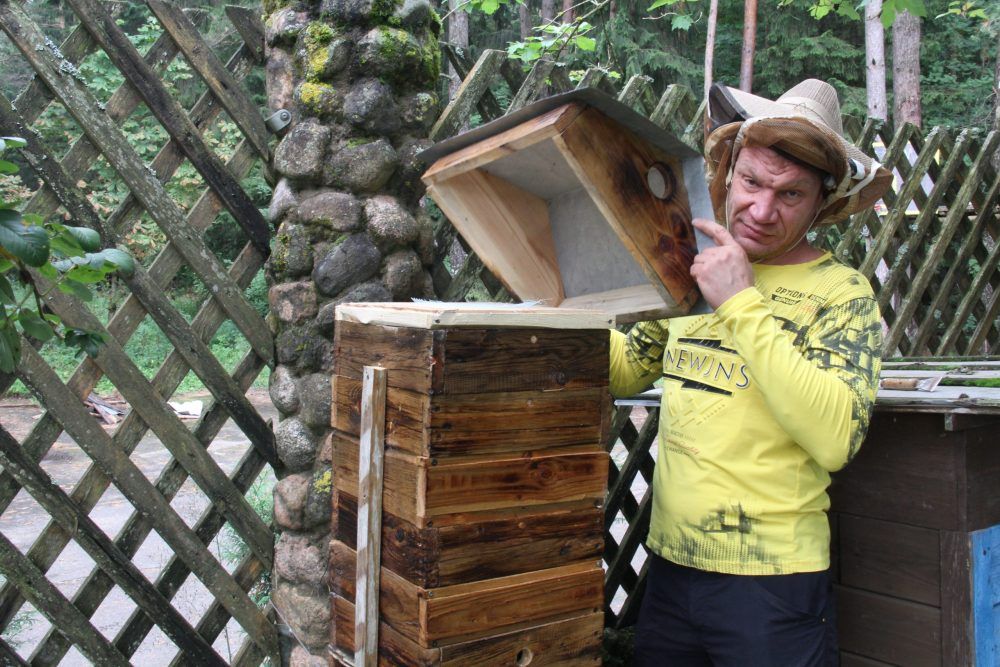 На приусадебном участке у нашего героя стоят три двадцатирамочных улья, два японских домика и один домик-телевизор