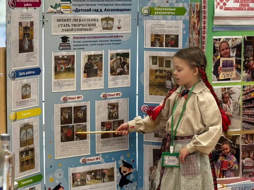 А Мария Лохач из д. Аксаковщина исследовала, может ли батлейка — народный белорусский театр кукол — стать творческой лабораторией. В процессе подготовки проекта Маша с воспитателем использовали все возможные ресурсы: от книг до интернета и даже ChatGPT. Своими руками они сделали батлеечный ящик. Девочка рассказывала о роли звука и освещения во время выступлений, о том, как свет меняет атмосферу спектакля.