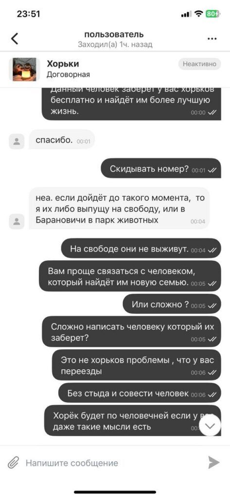 20 декабря мужчина написал девушке, что хочет вернуть животных, потому как не справляется с ними. Алина предложила забрать их, но без возвращения денег, на что получила категорический отказ. Тогда бывшая хозяйка животных поделилась контактом семьи, которая смогла бы забрать хорьков себе, однако ответ все равно был отрицательный.