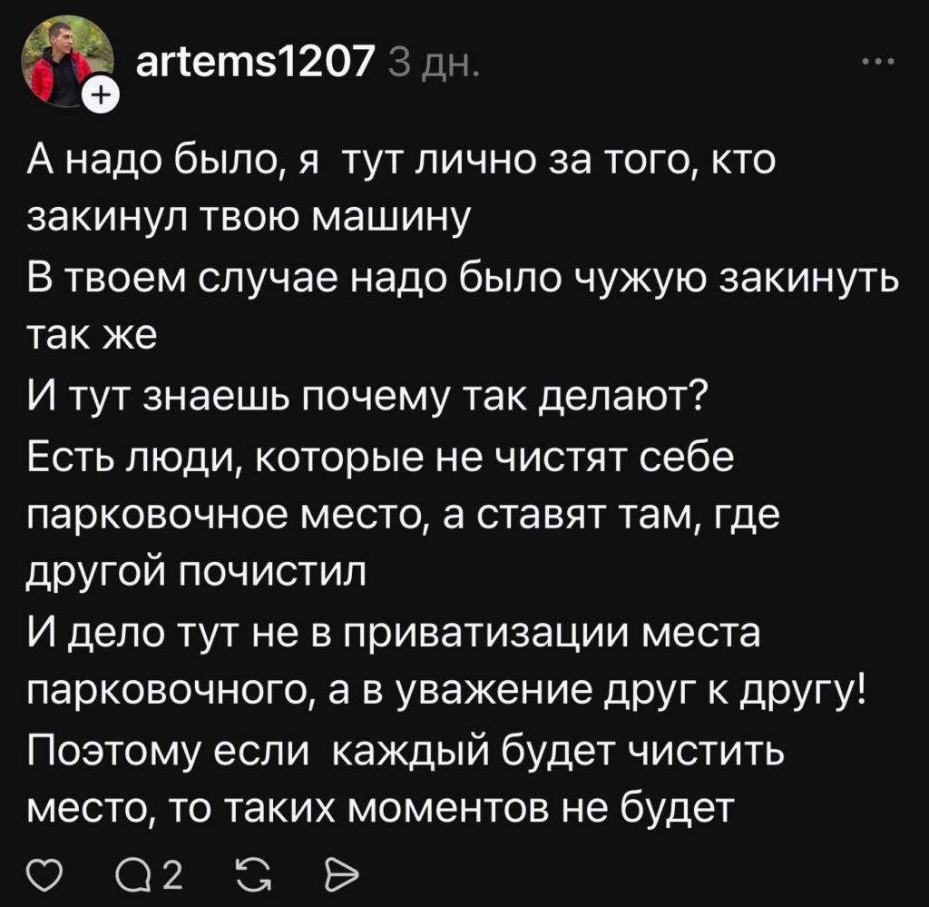 В подписи к посту автор коротко объяснил суть конфликта: человек обиделся, что на общей парковке встали на расчищенное место.