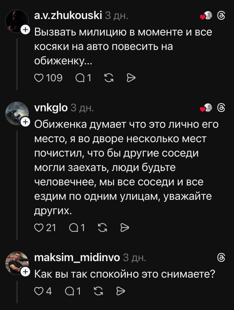 Параллельно читатели предлагали свои варианты мести – от серьёзных советов до откровенно шуточных идей. В числе таких реплик под постом было предложение: «Есть камаз навоза, нужно?) Играть так играть по их правилам». В комментариях придумали и собственное прозвище для тех, кто закапывал машину, – «обиженки». Сам автор в обсуждении пишет, что не собирается мстить.
