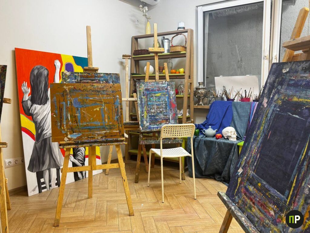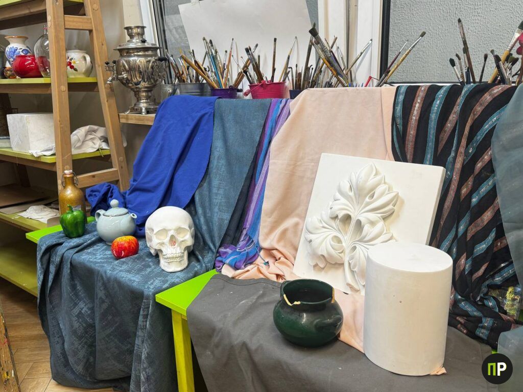 Спустившись по ступенькам, мы оказались в небольшом, но уютном творческом пространстве. На стеллажах – ряды баночек с красками и кистями, кувшины для натюрмортов. Выглядело все вдохновляюще, хотя немного смущало обилие стекла и красителей.