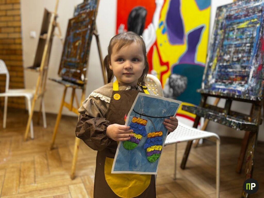 Софье подобрали подходящий по размеру передник и нарукавники, чтобы одежда оставалась чистой после первых художественных опытов. Дочка была настроена на творчество заранее, поэтому знакомство с педагогом Ириной прошло легко.