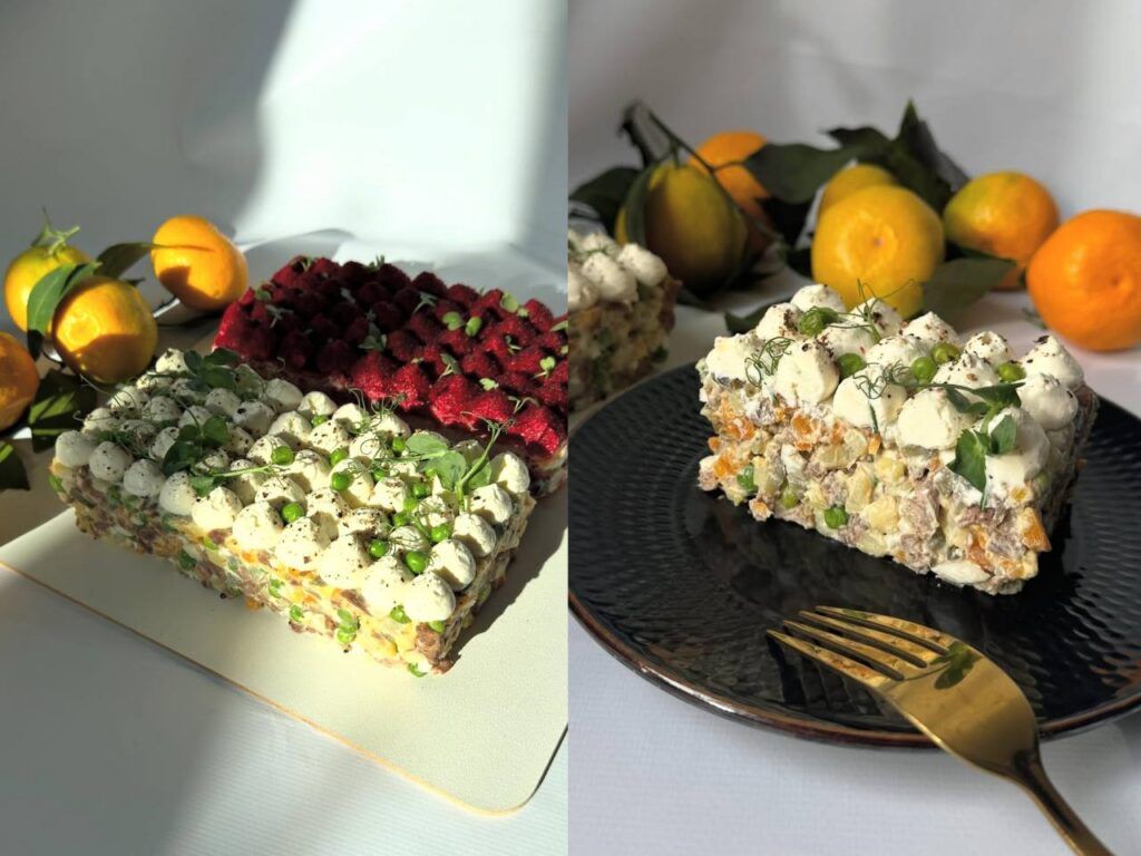 — Я называю это принципом «классический салат в неклассической подаче». Вкус — родной, а вид — праздничный и свежий. Сейчас в тренде порционность, слоеная подача в прямоугольных формах, декор, который хочется сфотографировать, — объясняет фуршетный мастер.