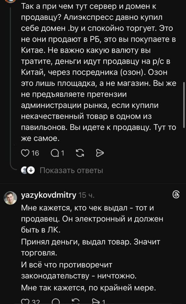 «Так а при чем тут сервер и домен к продавцу? Алиэкспресс давно купил себе домен .by и спокойно торгует. Это не они продают в РБ, это вы покупаете в Китае. Не важно какую валюту вы тратите, деньги идут продавцу на р/с в Китай, через посредника (озон). Озон это лишь площадка, а не магазин. Вы же не предъявляете претензии администрации рынка, если купили некачественный товар в одном из павильонов. Вы идете к продавцу. Тут то же самое».