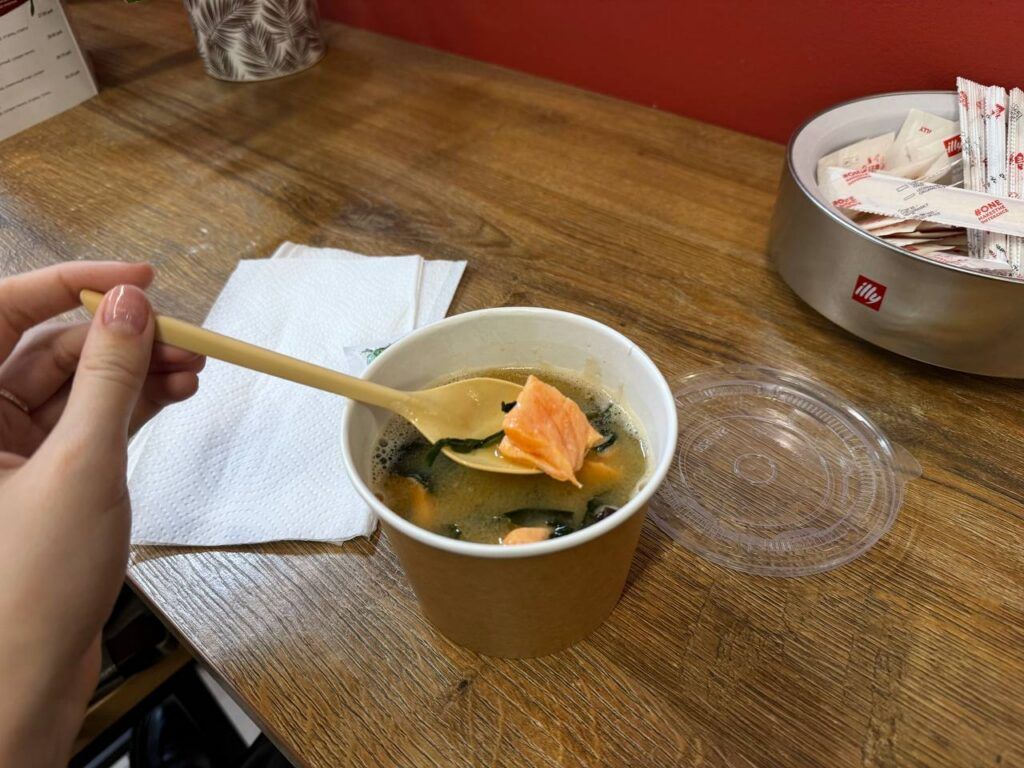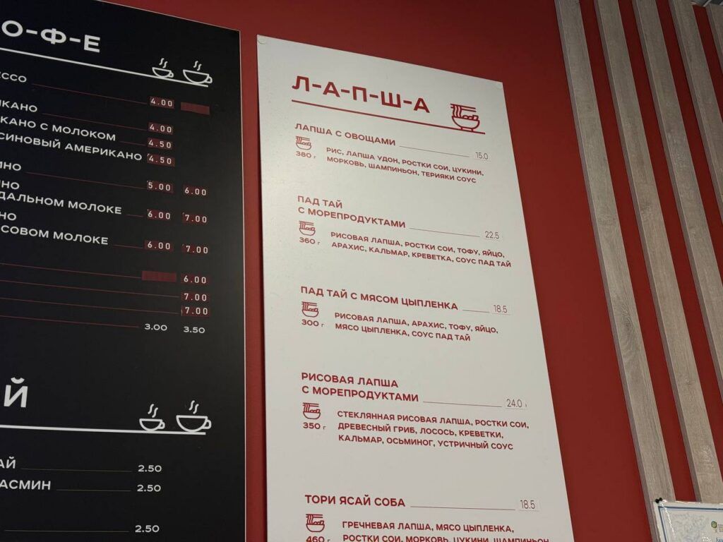 В некоторые дни пост разрешает рыбу, поэтому мы заглянули в My Sushi. Там можно взять большую порцию лапши с овощами (380 г) за 15 рублей и классический мисо-суп без рыбы за 6,4 рубля (в составе тофу, грибы шиитаке, водоросли). За 2 рубля можно добавить лосось. Правда, формат заведения — для быстрого перекуса: пластиковая посуда и барная стойка.