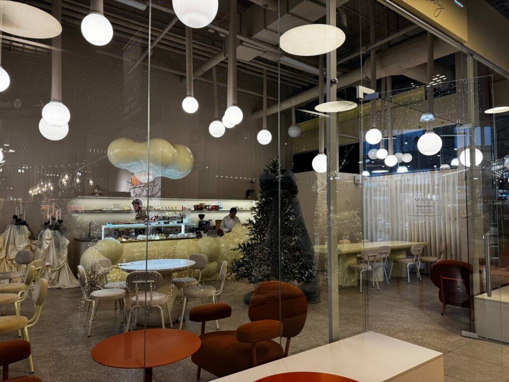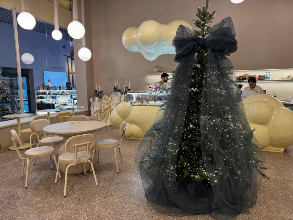 В будний день в обеденное время людей там почти не было. Пространство расположено в холле торгового комплекса «Валерьяново». Интерьер выдержан в светлых молочных оттенках со стеклянными стенами, не перегружен декором. При виде барной стойки и необычной инсталляции над ней почему-то возникла ассоциация с белым пористым шоколадом. В центре кондитерской стоит красивая трендовая ёлка с огромным бантом из зелёного фатина.