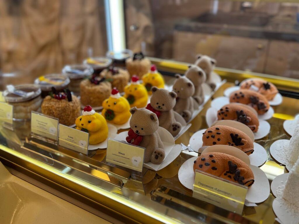 В меню есть завтраки, а витрина с десертами действительно удивила. Сладкие мишки, хомячки и единороги напоминали настоящие игрушки. В холодильнике были и более классические варианты, вроде «картошки», чизкейка и медовика в необычной подаче. Именно он и зацепил наш взгляд. К нему взяли американо с молоком.