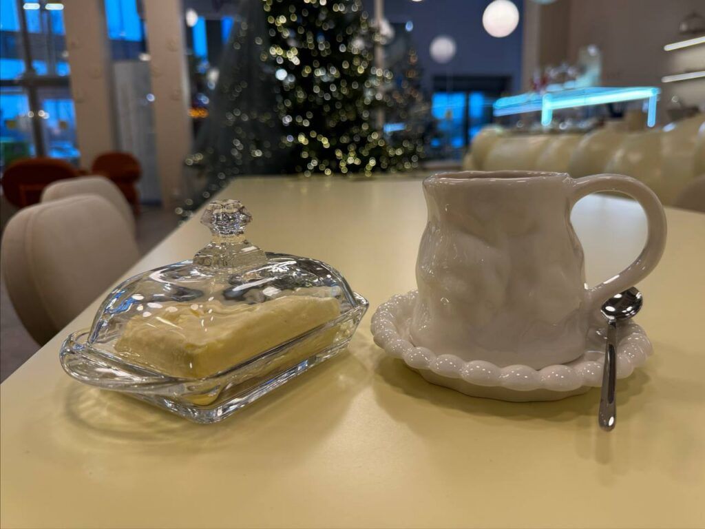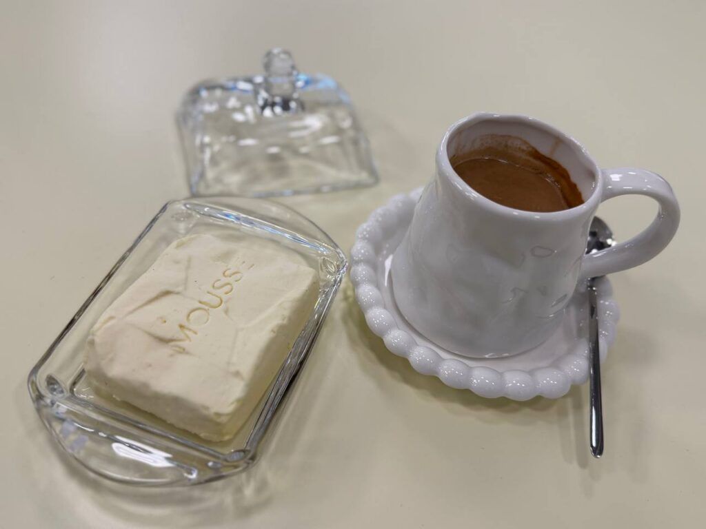 Классический медовик принесли в стеклянной маслёнке, а сам торт выполнен в виде кусочка сливочного масла. Американо подали в красивой инстаграмной кружке — сразу захотелось сфотографировать.