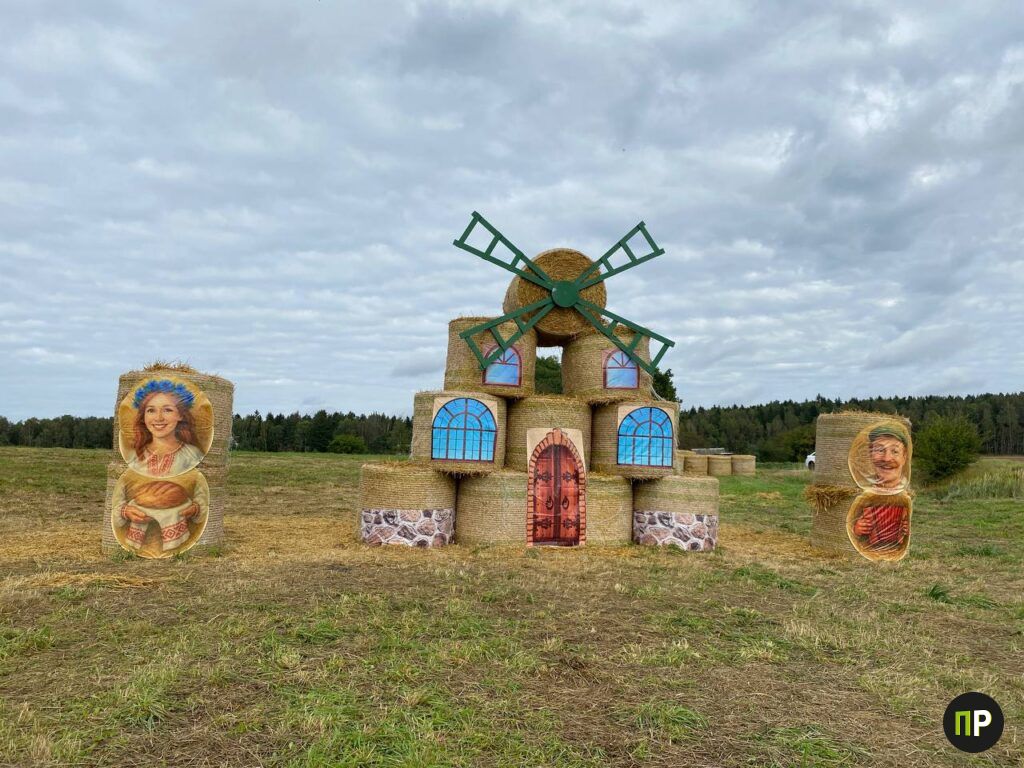 На создание аттракциона ушла почти неделя: нужно было установить столбы, расставить соломенные блоки и украсить их яркими флажками, которые сразу добавили пространству праздничного настроения. Рядом появилась и вторая инсталляция — мельница с фигурами деда и девушки, собранная из 14 круглых тюков. Она сразу же завоевала симпатию маленьких гостей.