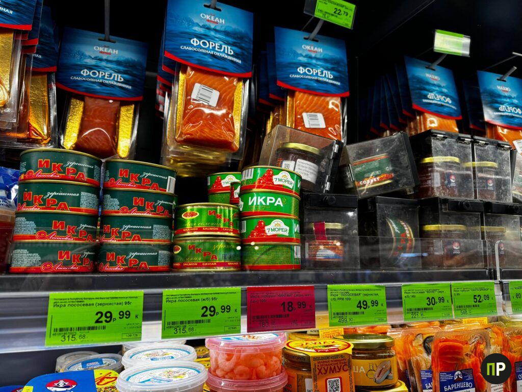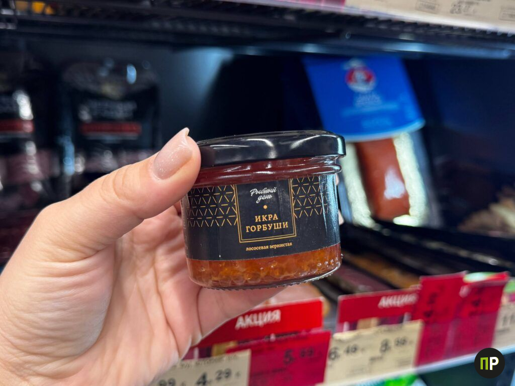 Ассортимент здесь оказался скромным — всего два вида. Та самая «Лососевая Совьет», но в меньшей фасовке (105 г), предлагается по цене 20.99 рублей. Второй вариант — икра горбуши «Рыбный День» — стоит 29.99 рублей за баночку 95 грамм.