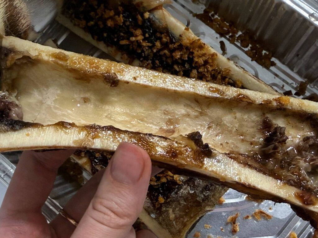 Пока мы ели суп, приготовили необычное блюдо, в котором содержится большое количество «живого коллагена», – мозговые кости за 19 рублей. Ожидание чуть дольше – около 10–15 минут, потому что их запекают прямо перед подачей. На тарелке оказывается почти килограмм продукта: четыре крупные порции нежного костного мозга прямо в кости, который по консистенции напоминает слегка желеобразную, немного растопленную массу – рыхлую, солоноватую, с тонким мясным ароматом. Сверху – сладкий карамелизированный лук насыщенного коричневого цвета и хрустящая золотистая «шубка» из жареного лука, которая добавляет текстурный контраст. К ним также идет несколько ломтиков фирменного хлеба.